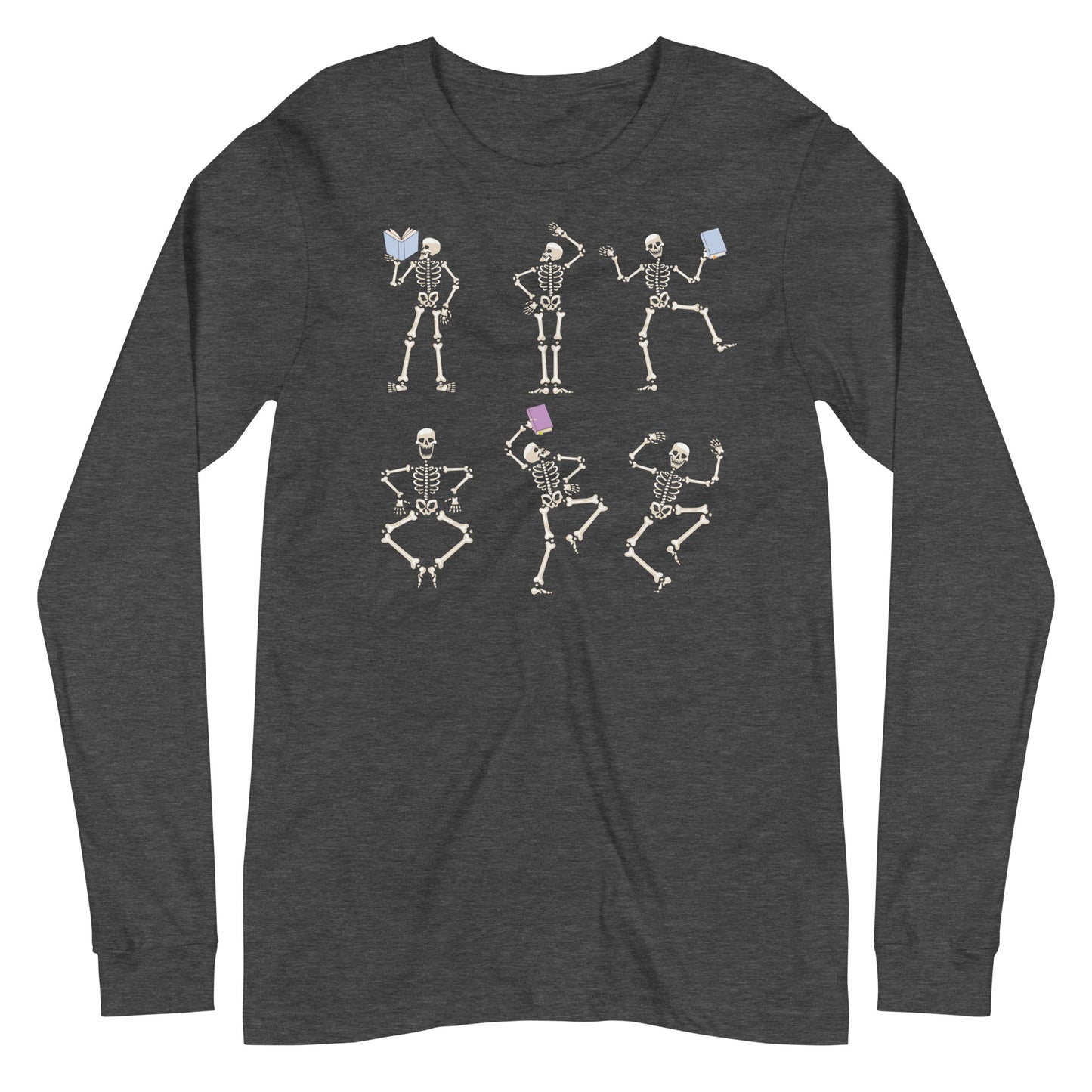 This spooky yet whimsical unisex long sleeve tee is sure to get you in the spirit of Halloween! Featuring dancing skeletons reading books, it's the perfect way to dress for your next hauntingly fun event! Boo-k out this look today!